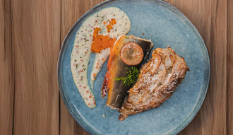 Fisk: åpne den rensede fisken i midten og krydre innsiden med salt og pepper. Legg sitronskivene, løken og dillen i fisken og brett den sammen igjen. Legg fisken i røykekurven på grillristen.